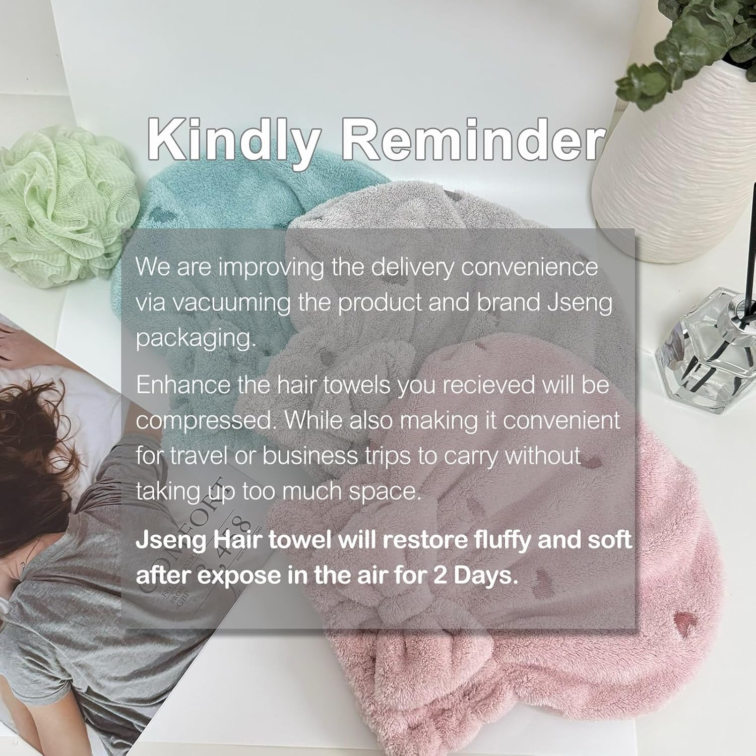 Elevate your hair care routine with the Jseng 3-Pack Microfiber Hair Towel. Designed for women who value efficiency, style, and hair health, our microfiber hair towels offer an unmatched drying experience. Made with ultra-absorbent, fast-drying microfiber, these Hair towels quickly wick away moisture, helping to reduce drying time and minimize heat exposure from blow-drying. Each Hair towel wrap features a secure, slip-resistant design with a chic bow, adding a touch of elegance to your post-shower routine. The soft, lightweight fabric is perfect for all hair types, including delicate or damaged hair, helping to reduce frizz and breakage for smooth, healthy hair. This versatile 3-pack includes three lovely colors to match your mood and style. Compact and lightweight, these hair towels are ideal for home, gym, or travel. With Jseng, you can achieve salon-level results from the comfort of your own home. Treat yourself or gift someone special with these stylish, practical, and gentle hair towels – the perfect addition to any hair care routine.