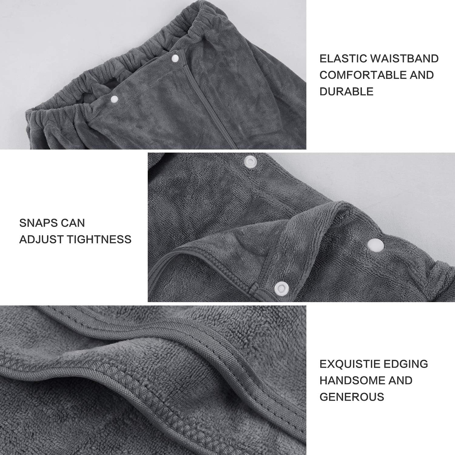 - Snap Buttons & Front Pocket: The towel wraps adopt snap closure design, allowing you to open and close without paying too much efforts and energy, also, with the elastic band at the waist, you can adjust them according to your needs, bringing you a lot of convenience. Front pocket can keep your hands warm or store your items