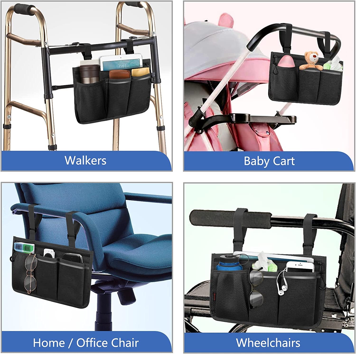 Attached with two adjustable hook-and-loop straps, you can attach and remove the straps to fits all standard wheelchairs, walkers, mobility scooters, office chairs, baby cart, and transport chairs.